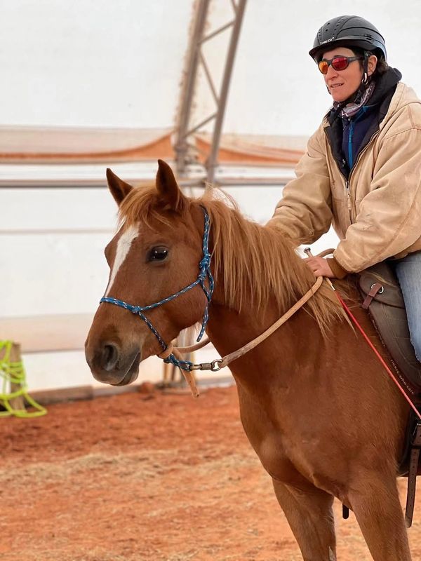 Sarah Sycinski: wont buck you off, paces when nervous (but doesn't act stupid-me) might Gait if you go faster-he's a Missouri Foxtrotter, would most likely go better in company ie: trails, sweet and gentle to brush, feet and tack up, stands nicely to hose off. He is in a D bit with copper roller and we are using the Barefoot saddle on him for comfort.